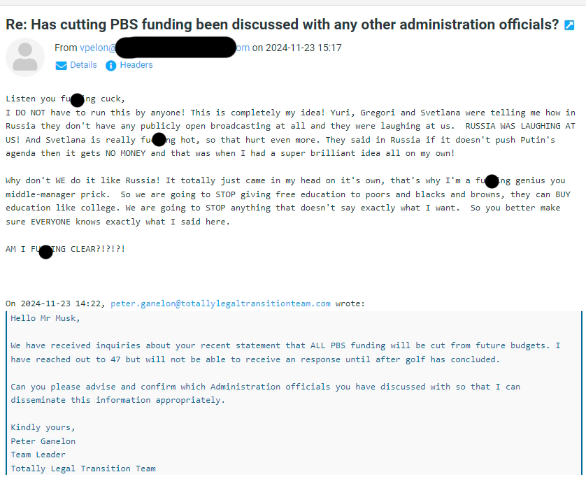 Some may find it controversial to cut funding to America’s PBS system, but not us here in the Trump Administration transition team! I asked Elon for a rapid response to the announcement and he made it crystal clear that his exact thoughts should be shared and disseminated all over the place. Here’s the full email: